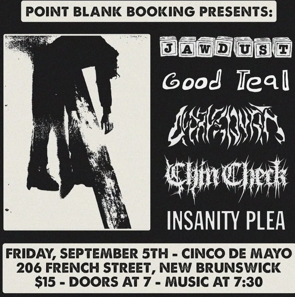 Sep 5 Venue, New Jersey Jaw Dust, Good Teal, Depressionista, Chin Check, Insanity Plea-NJ Friday, September 5, 2025 7:00 PM 11:00 PM Cinco De Mayo (map) Google Calendar ICS View Event →