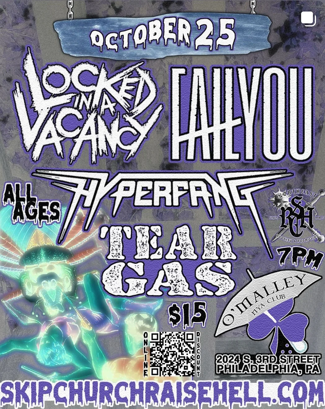 Oct 25 Venue, Pennsylvania Locked In A Vacancy, Fail You, Hyperfang, Tear Gas-PA Saturday, October 25, 2025 7:00 PM 11:00 PM O'Malley NYA (map) Google Calendar ICS View Event →