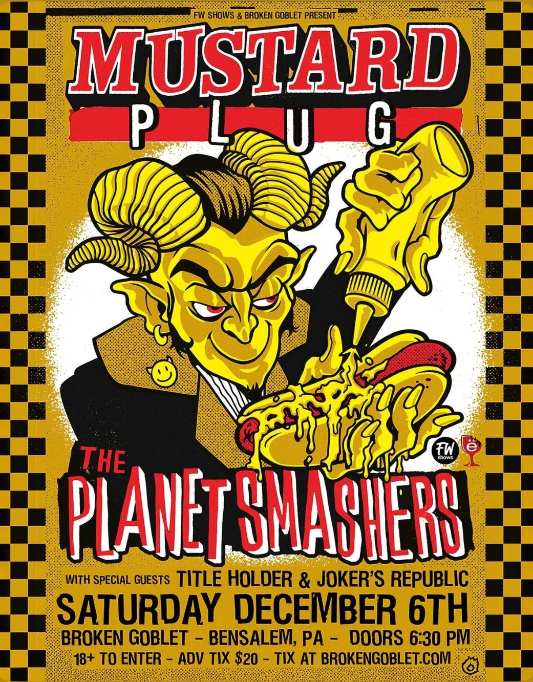 Dec 6 Mustard Plug, The Planet Smashers, Title Holder, Joker's Republic-PA Saturday, December 6, 2025 6:30 PM 11:30 PM Broken Goblet (map) Google Calendar ICS View Event →