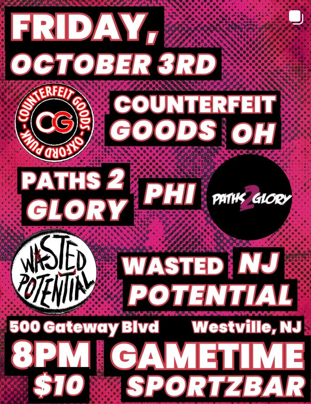 Oct 3 New Jersey, Venue Wasted Potential, Paths 2 Glory, Counterfeit Goods-NJ Friday, October 3, 2025 8:00 PM 11:00 PM Gametime Sportzbar (map) Google Calendar ICS View Event →