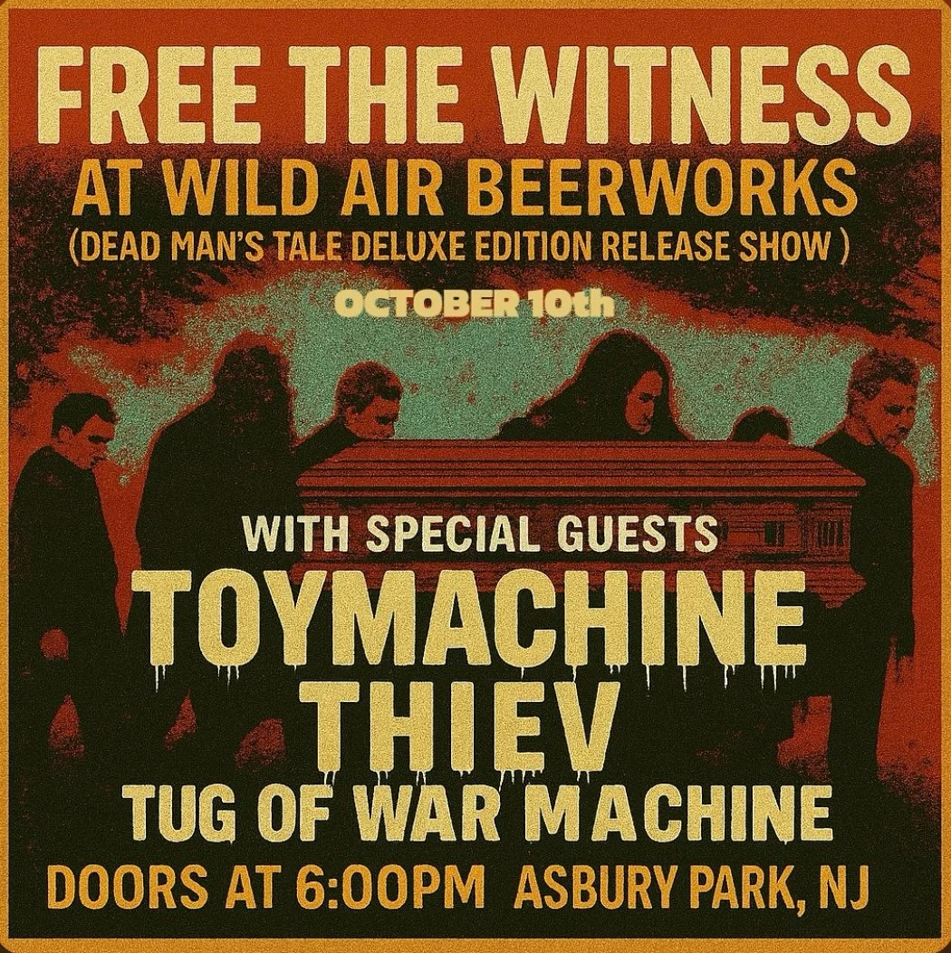 Oct 10 Free The Witness, Toymachine, Thiev, Tug Of War Machine-NJ Friday, October 10, 2025 6:00 PM 11:00 PM Wild Air Beerworks (map) Google Calendar ICS View Event →