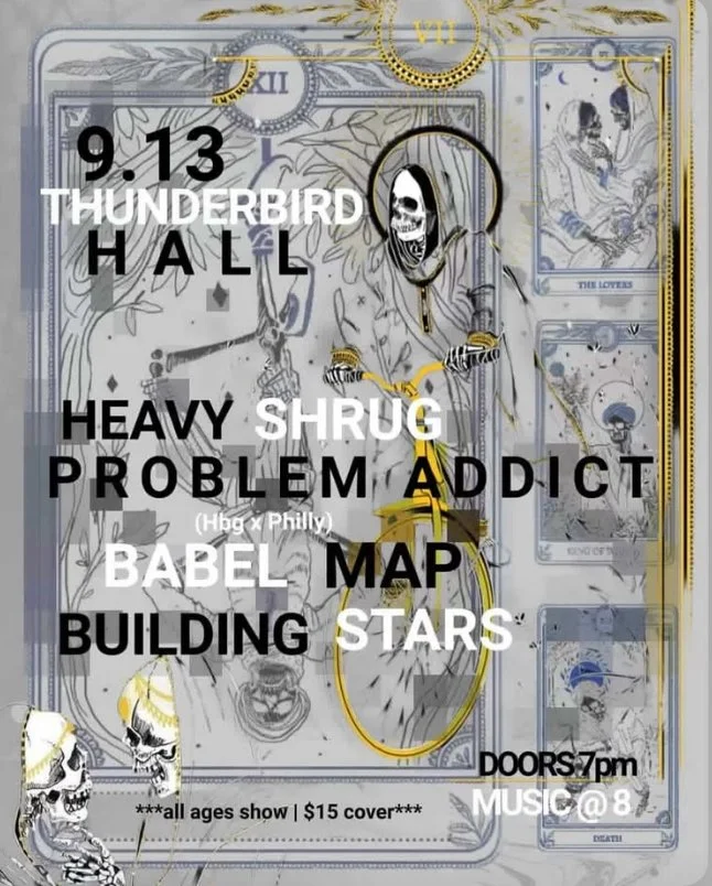 Sep 13 Venue, Pennsylvania Heavy Shrug, Problem Addict, Babel Map, Building Stars-PA Saturday, September 13, 2025 7:00 PM 11:00 PM Thunderbird Hall (map) Google Calendar ICS View Event →
