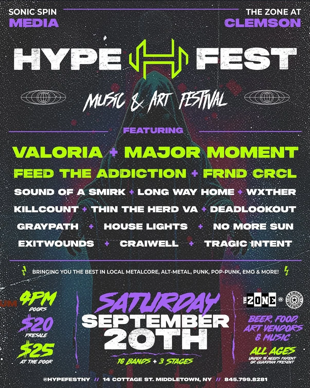 Sep 20 Hypefest (See Flyer For Bands)-NY Saturday, September 20, 2025 4:00 PM 11:30 PM 14 Cottage Street Middletown, NY, 10940 United States (map) Google Calendar ICS View Event →