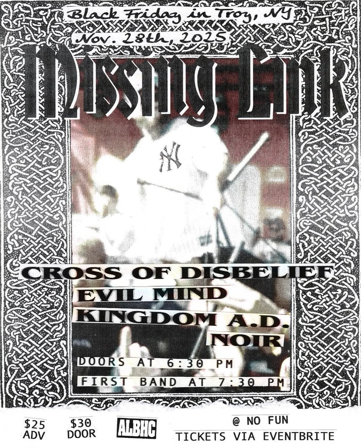 Nov 28 Venue, New York Missing Link, Cross of Disbelief, Evil Mind, Kingdom A.D, Noir-NY Friday, November 28, 2025 6:30 PM 11:30 PM No Fun (map) Google Calendar ICS View Event →