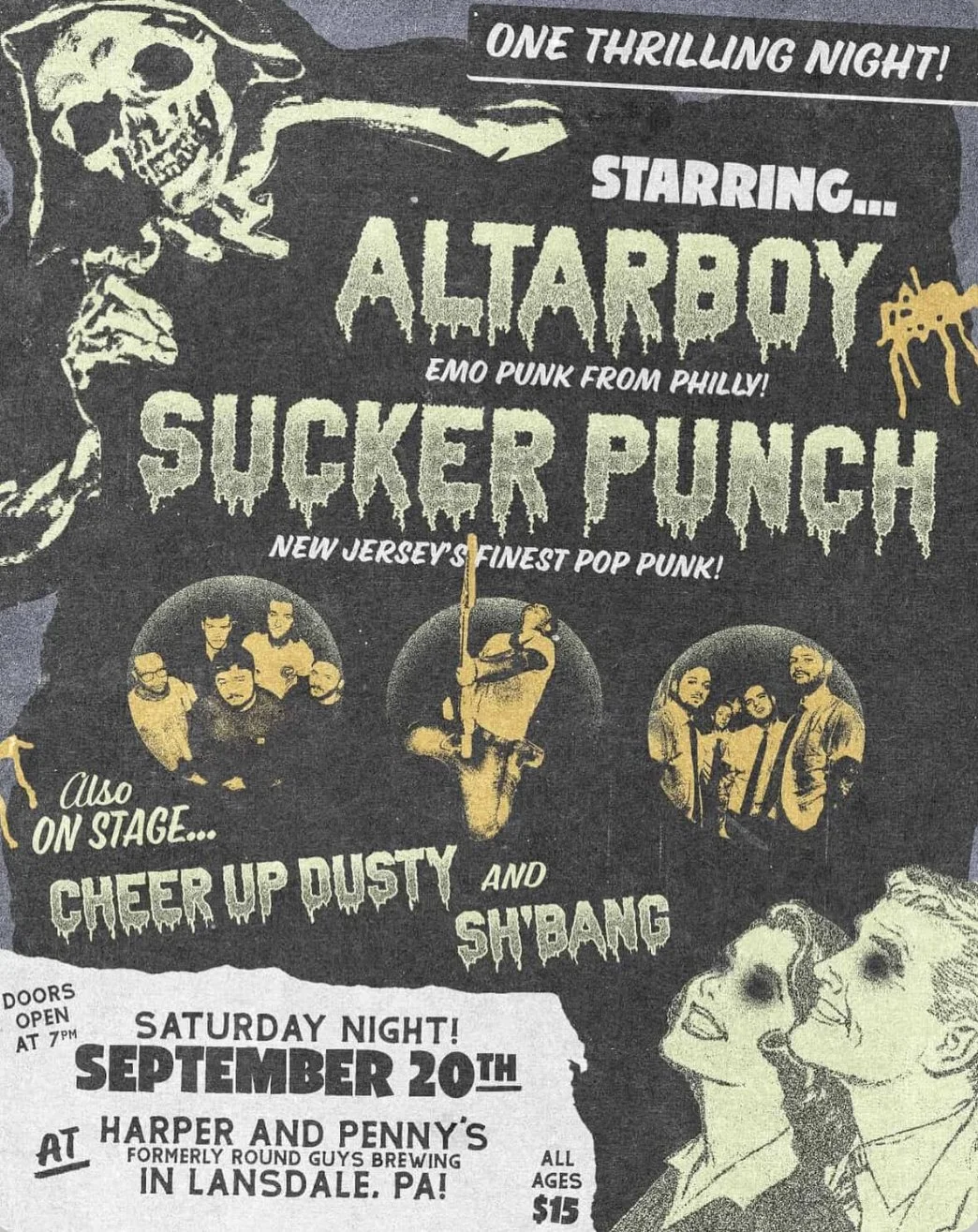 Sep 20 Altarboy, Sucker Punch, Cheer Up Dusty, Sh'Bang-PA Saturday, September 20, 2025 7:00 PM 11:00 PM Harper and Penny's (formerly Round Guys) (map) Google Calendar ICS View Event →