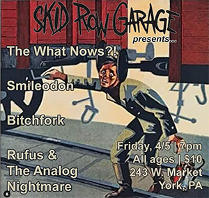 The What Nows?!, Smiledon, Bitchfork, Rufus & The Analog Nightmare-PA Friday, April 5, 2024 7:00 PM 10:30 PM Skid Row Garage 243 W. Market York, PA (map) Google Calendar ICS The What Nows?!, Smiledon, Bitchfork, Rufus & The Analog Nightmare All AgesTickets $10