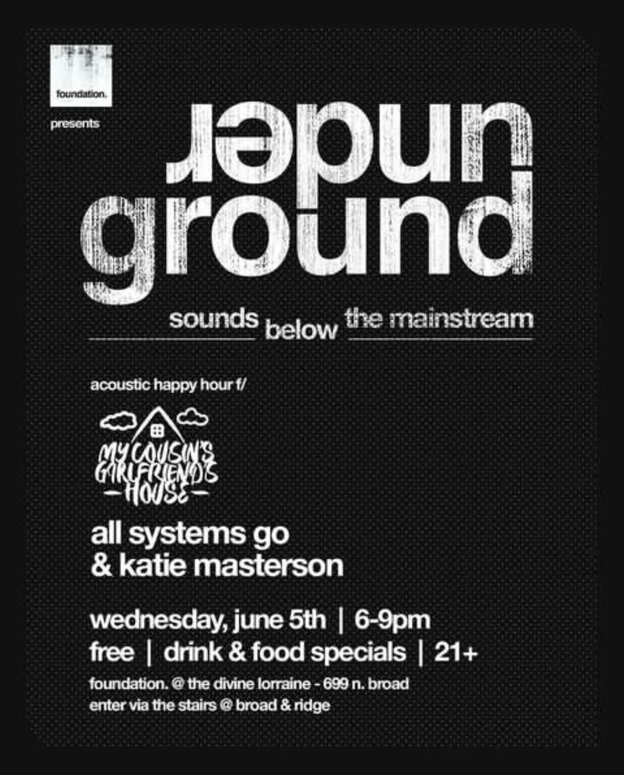 My Cousin's Girlfriend's House, All Systems Go, Katie Masterson-PA Wednesday, June 5, 2024 6:00 PM 9:00 PM Foundation @ The Divine Lorraine 699 North Broad Street Philadelphia, PA, 19123 United States (map) Google Calendar ICS