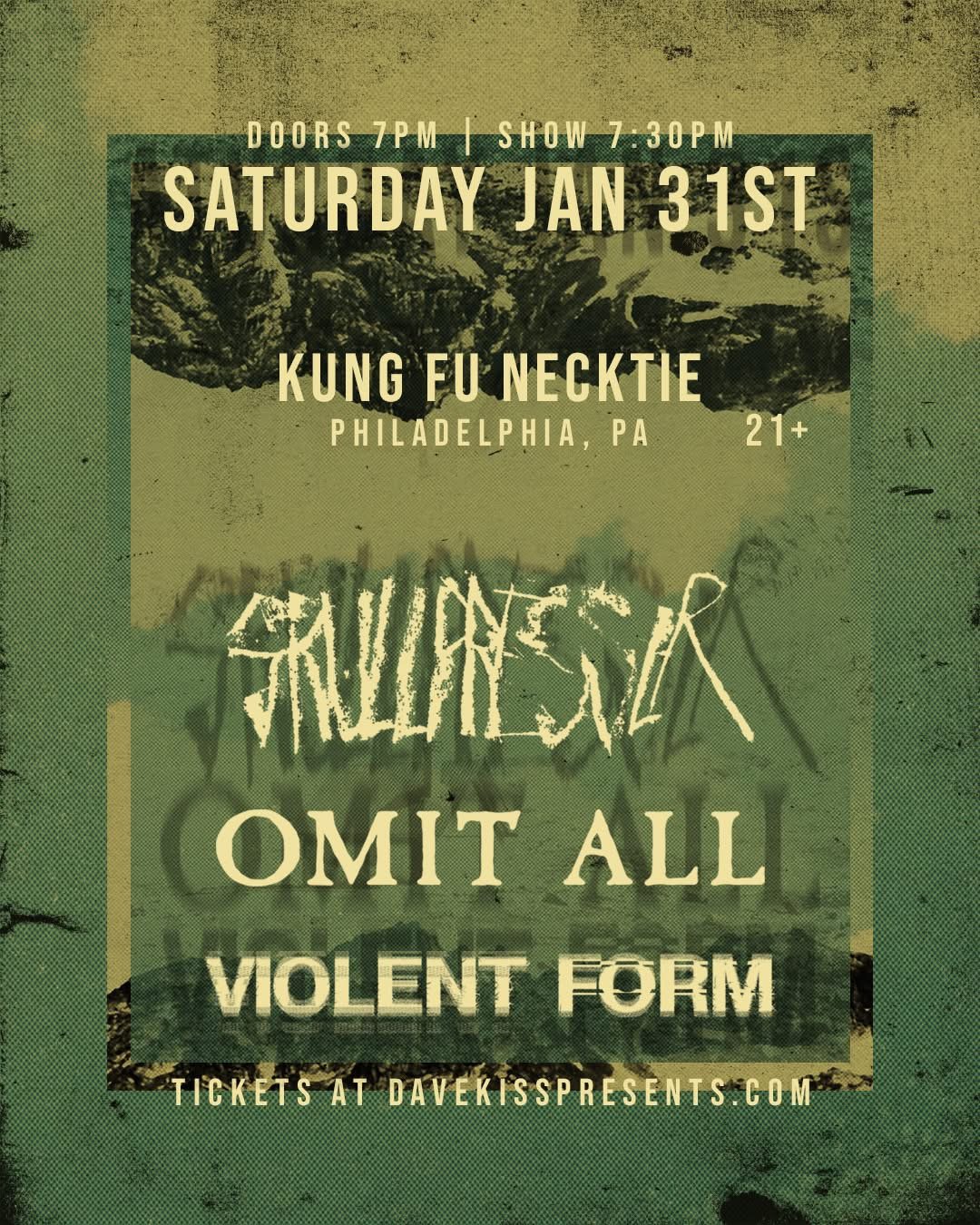 Back to All Events Skull Presser, Omit All, Violent Form-PA Saturday, January 31, 2026 7:30 PM 11:00 PM Kung Fu Necktie 1248 North Front Street Philadelphia, PA, 19122 United States (map) Google Calendar ICS