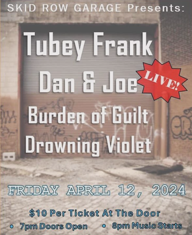 Tubey Frank, Dan & Joe, Burden of Guilt, Drowning Violet-PA Friday, April 12, 2024 7:00 PM 10:30 PM Skid Row Garage 243 West Market Street York, PA, 17401 United States (map) Google Calendar ICS All AgesTickets:At The Door $10